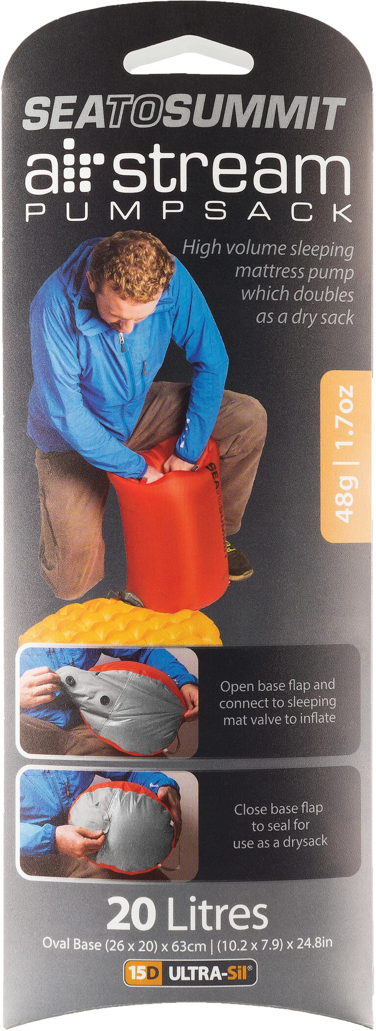 L’Air Stream est une grande pompe à matelas basée sur le sac ultra-silencieux Nano Dry Sack 20L de Sea to Summit, avec une valve et une pédale. L’effet Venturi vous permet de gonfler le flux d’air d’un seul souffle. Pour remplir un matelas Sea to Summit, vous n’avez besoin que de deux ou trois répétitions, ce qui vous permet de gonfler le matelas très rapidement, avec un minimum de condensation respiratoire et sans vertiges. Le Air Stream peut également être utilisé comme sac à sec de 20 L ou comme sac à dos ultraléger.